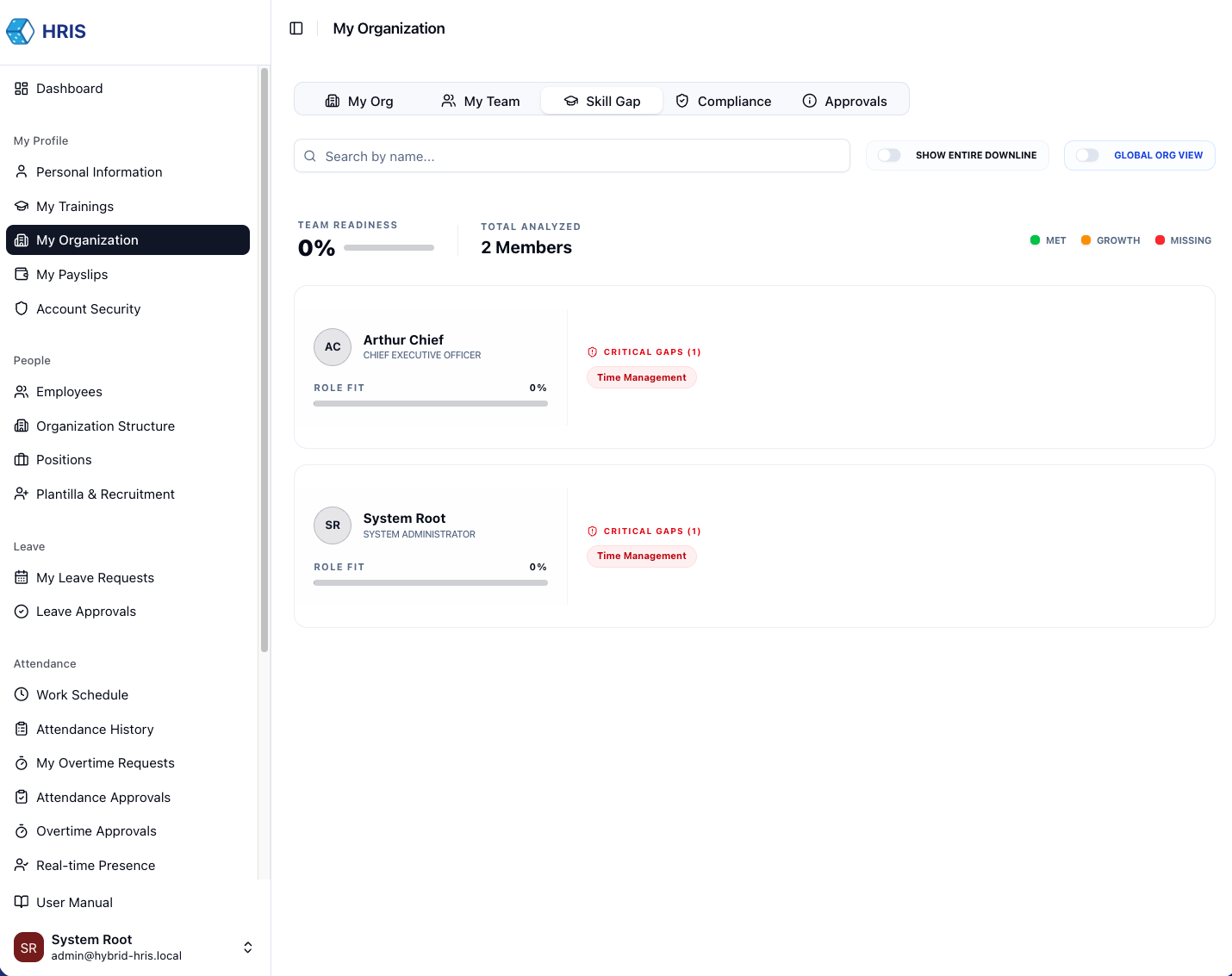 Understand your place in the organizational hierarchy, visualize your team, and track your personal compliance and skill readiness.