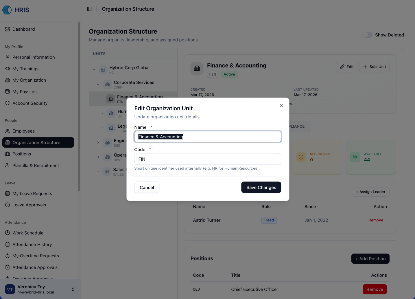 Navigate to Administration → Org Units. Use the tree view to visualize parent-child relationships between units.