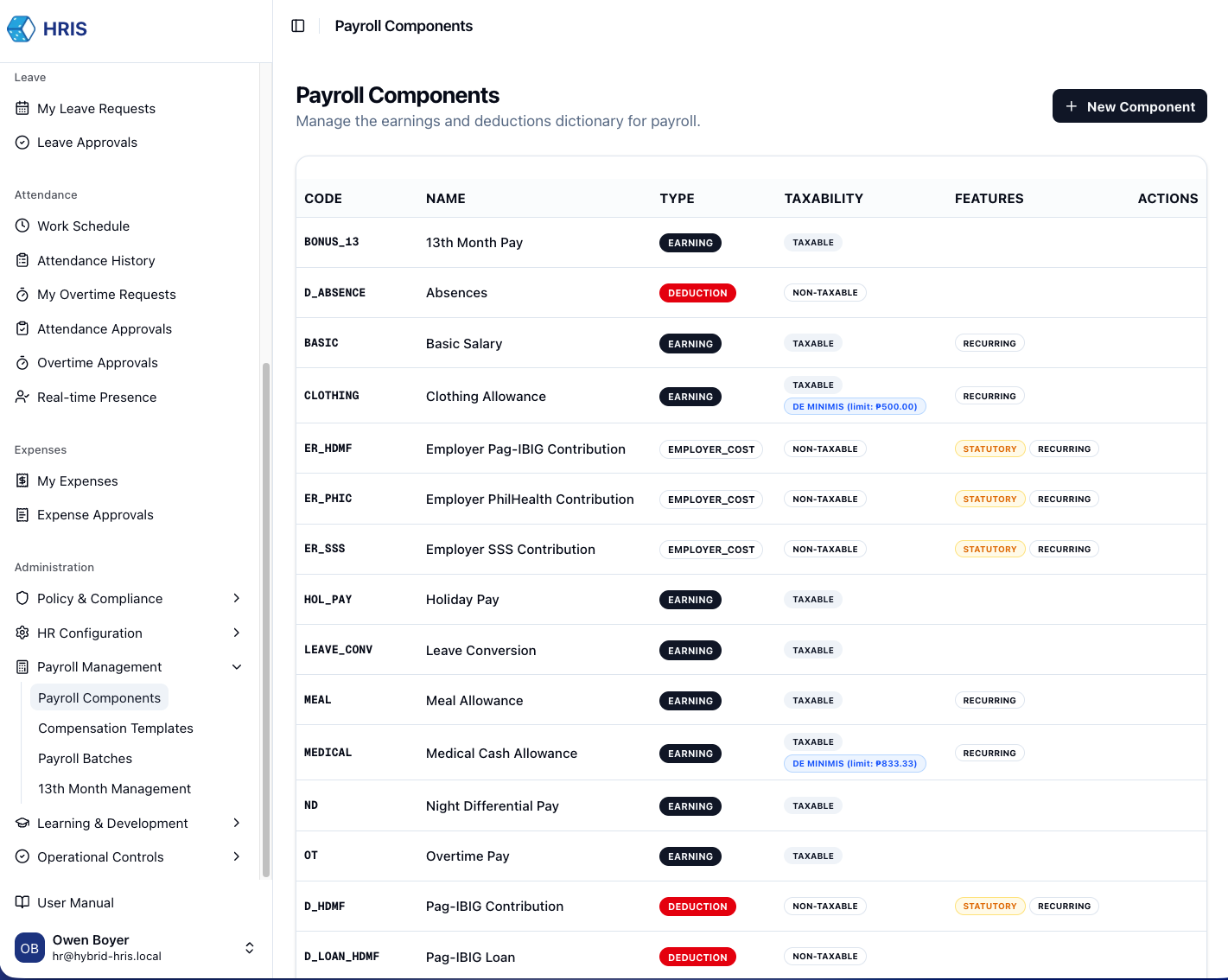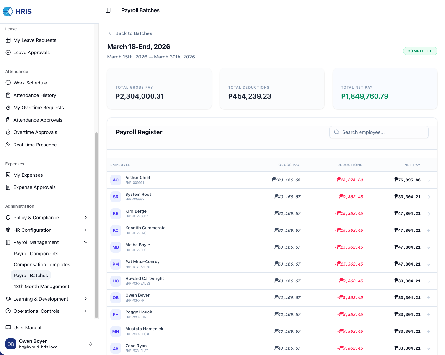 The system automatically pulls approved attendance, overtime, and expense claims. Review individual line items for accuracy.