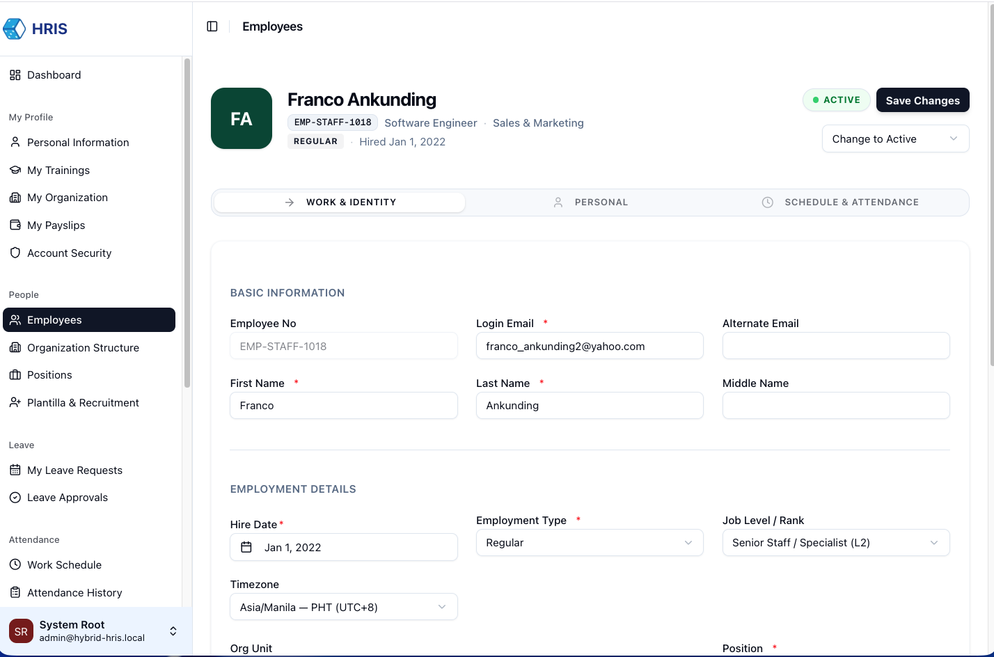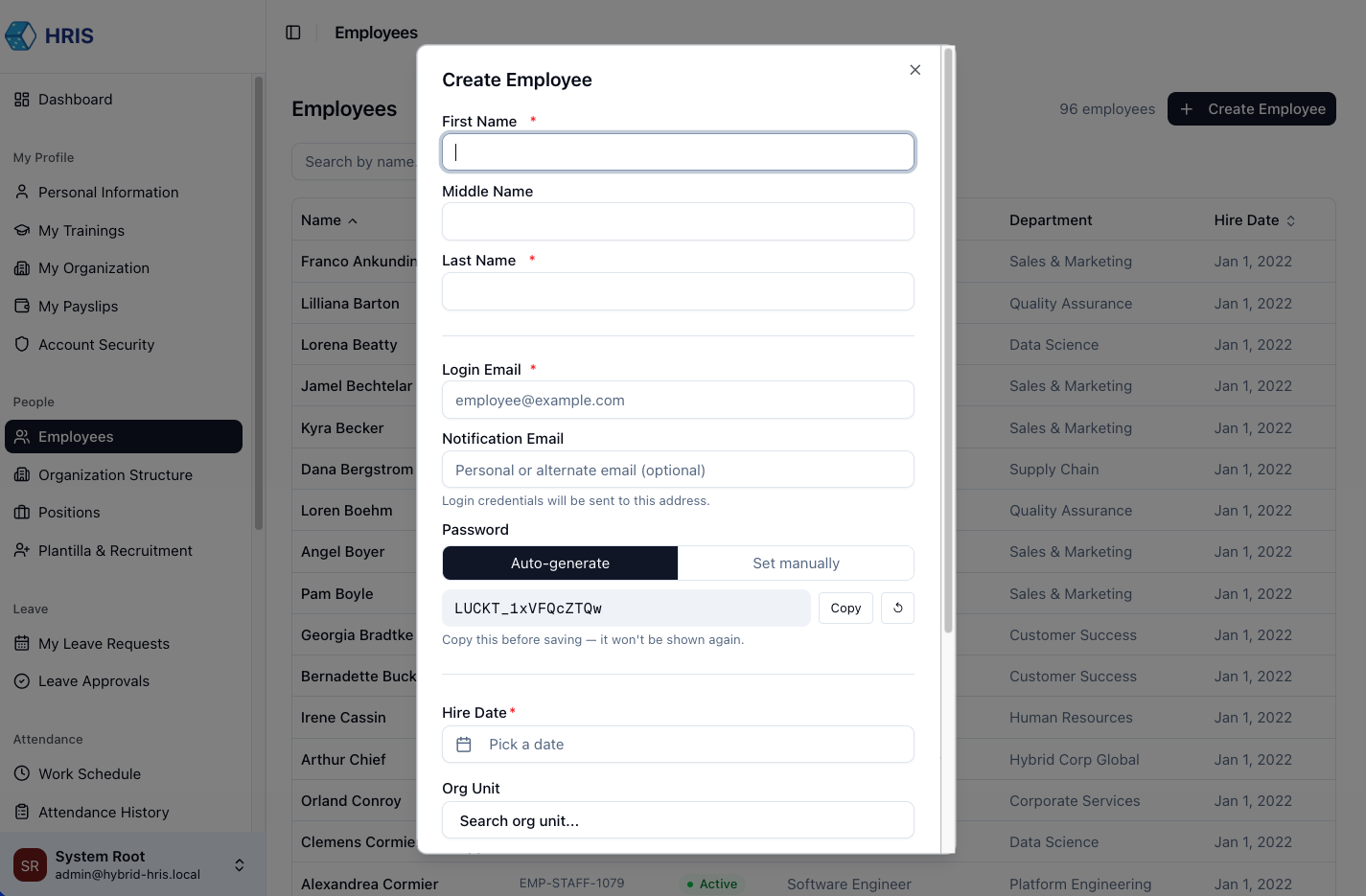 Navigate to Administration → Users and click + Add Employee. You will need to provide basic identity info and assign them to an initial Org Unit and Position.